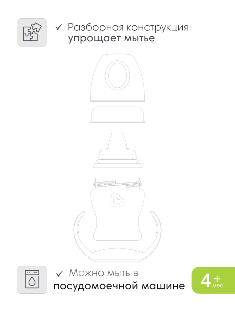 Ручки поильника, при необходимости, можно снять. Особое гибкое основание носика, напоминающее гармошку, позволяет без труда держать поильник под углом и пить, не разливая содержимое.