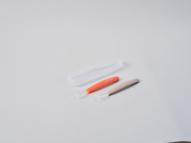 В комплекте две силиконовые ложки с ручками разного цвета и плотный прозрачный футляр для хранения в чистоте и для удобства взять ложечки в дорогу.