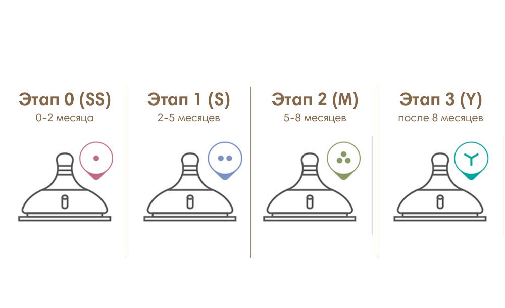Всего у сосок Mother-K 4 этапа в зависимости от возраста малыша: