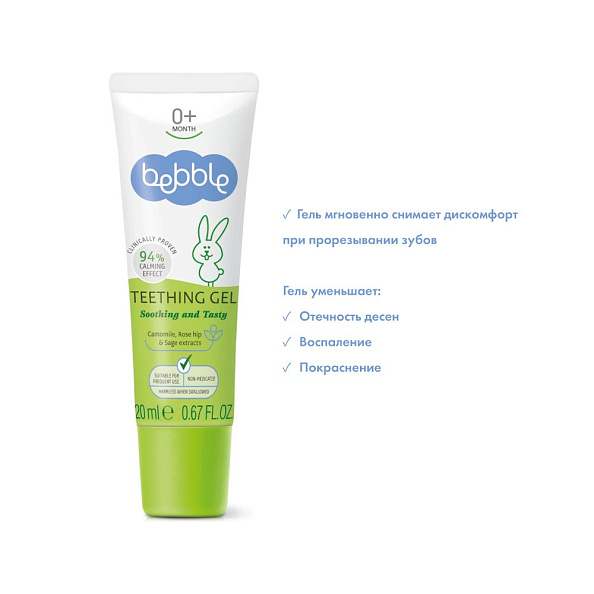 Гель для десен при прорезывании зубов Bebble с экстрактами трав и успокаивающими ингредиентами облегчает раздраженные, опухшие десны. Клиническое тестирование* Геля для десен Bebble под наблюдением врача-стоматолога доказало, что он: оказывает успокаивающее действие в 94,4% случаях, уменьшает дискомфорт при прорезывании зубов на 86,25%, помогает снять симптомы воспаления (отек, покраснение, гематома), помогает снизить большое слюноотделение и боль, не содержит лекарственных ингредиентов, этанола, консервантов, спиртов и красителей, т.е. не имеет ограничений в использовании, подходит для использования в сочетании с гомеопатическими средствами, безвреден при проглатывании, с растительными компонентами, способствующими облегчению прорезывания зубов и восстановлению десен, с гиалуронатом натрия, который полезен для десен, с приятным фруктовым вкусом и ароматом, благодаря сочетанию природных подсластителей, без мяты и фтора, без сахара, сахарина и аспартама.