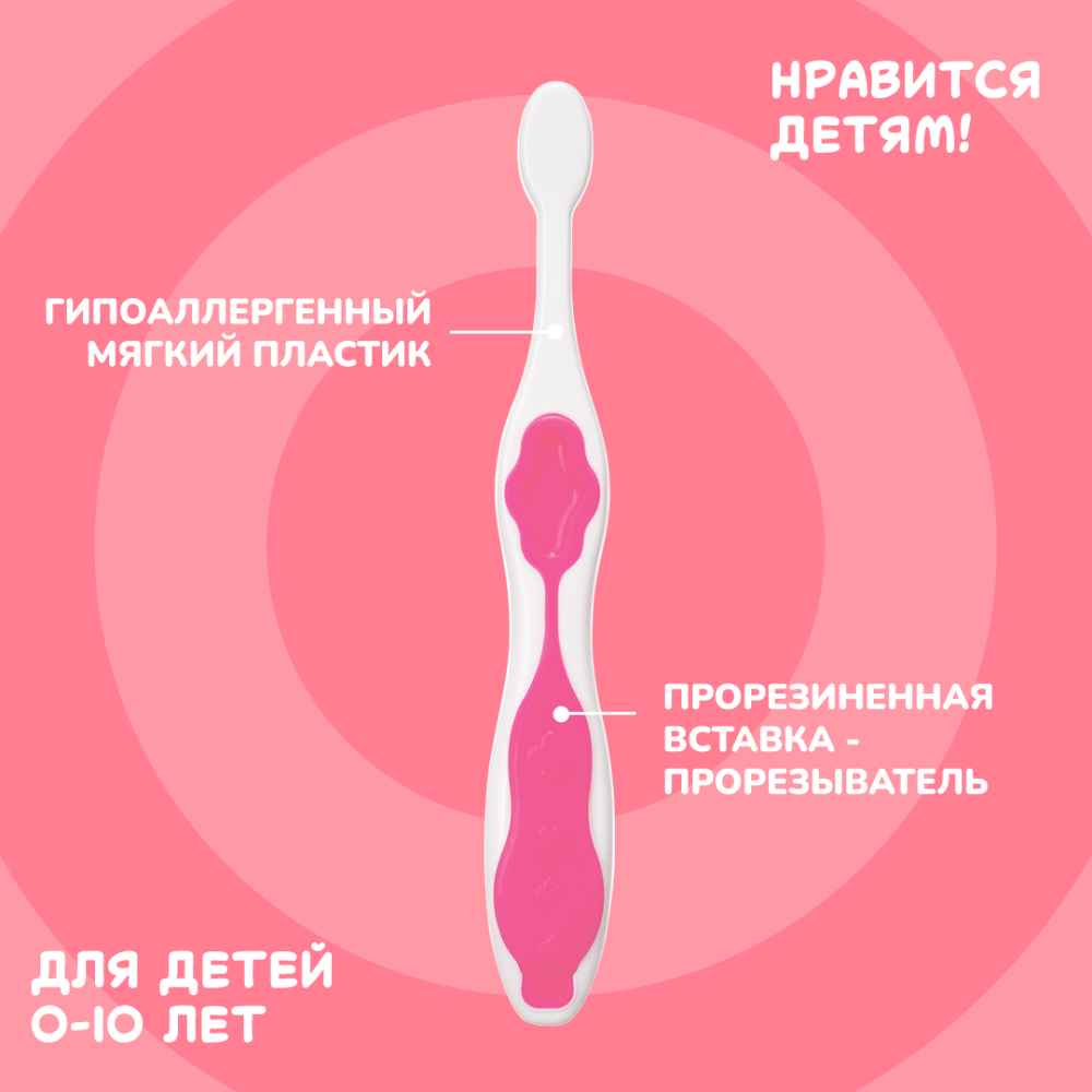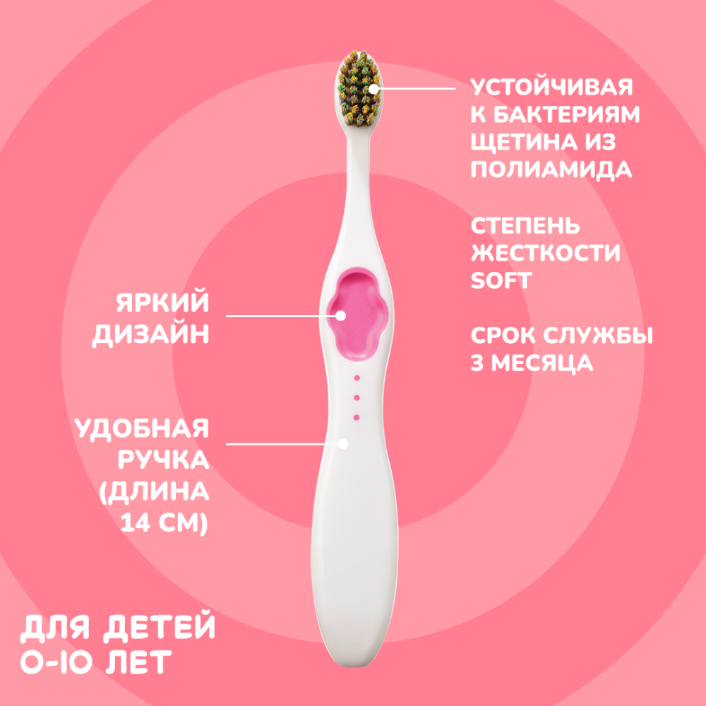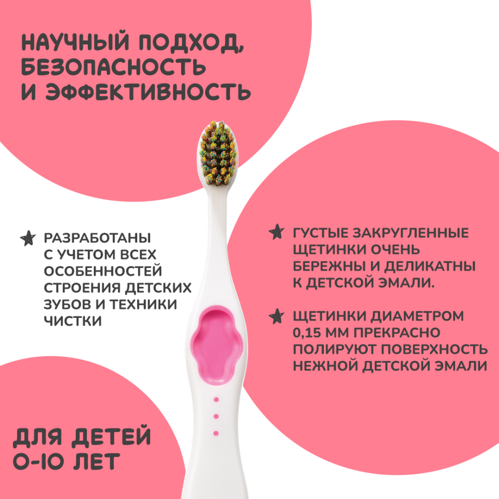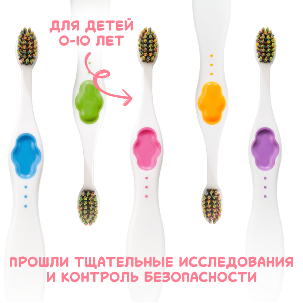 - Коллекция красочных детских зубных кистей разработана с учетом всех особенностей строения детских зубов и техники чистки детей с момента прорезывания первого зуба