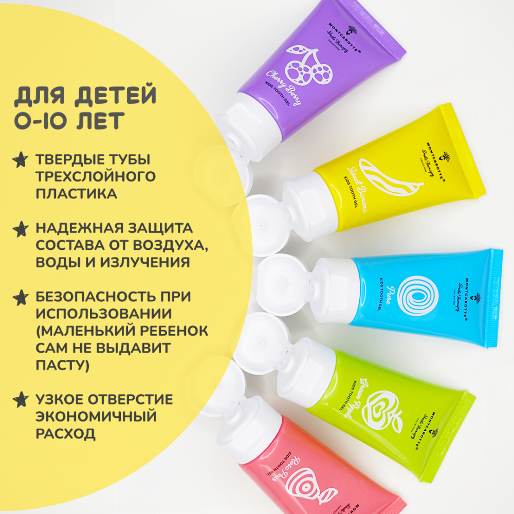 Коллекция детских зубных гелей разработана в специализированной фармацевтической лаборатории MontCarotte в Италии. Годы учебы и исследований, высоко квалифицированный персонал и передовые технологии позволили создать безупречную, абсолютно безопасную линию детских зубных гелей.