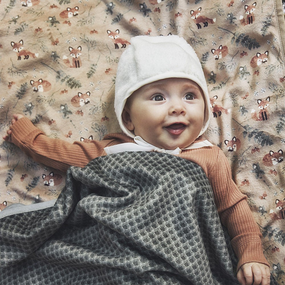 Плед Elodie выполнен из мягкого велюра Pearl Velvet, который на ощупь напоминает одновременно плюшевого мишку и гладкий бархат, но в то же время обладает влагоизоляционными свойствами, необходимыми для детских одеял. Материал нового поколения пленяет своей нежностью и теплотой. Малыш с удовольствием закутается в него во время прогулки или будет обнимать, как любимую игрушку во время сна.
