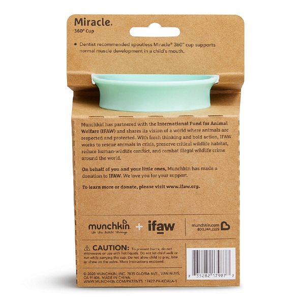 Приобретая этот поильник-непроливайку, вы помогаете Munchkin внести важный вклад в деятельность Международного фонда защиты животных (IFAW) и проекта «Китовый заповедник». Вы помогаете сделать важное дело — спасти редкие виды животных от полного исчезновения. А если учесть тот факт, что поильник Munchkin MIRACLE® 360° является самым популярным поильником в мире, - животные точно будут спасены!
