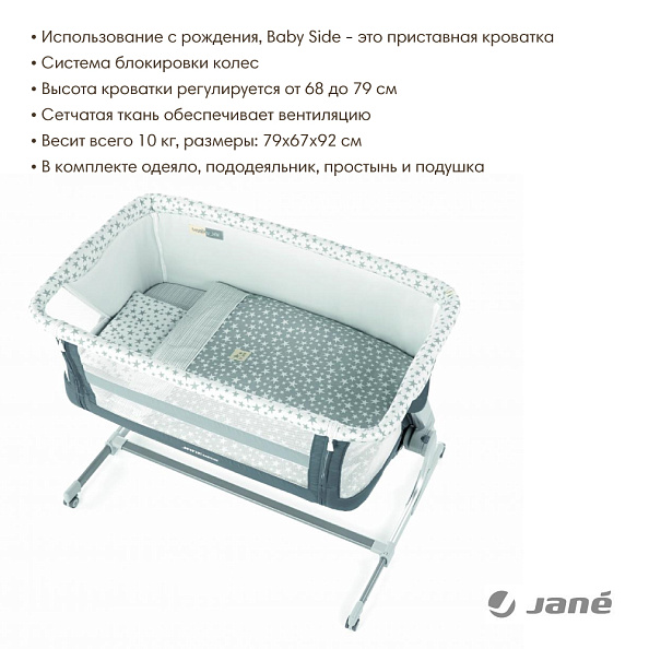 Jane Baby Side - это приставная кроватка. Очень удобная и функциональная, может использоваться для совместного сна ребенка вместе с родителями. Для этого нужно опустить боковую стенку, придвинуть кроватку к родительской и пристегнуть ее ремешками, которые входят в комплект. А также как отдельная кроватка для вашего малыша (после поднятия боковой стенки). Максимальный комфорт для всех.