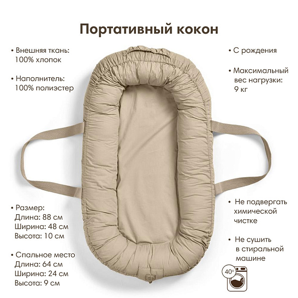 Верхняя часть кокона изготовлена из 100% хлопка и легко снимается, её можно стирать в машине. Мягкий поролоновый матрас устанавливается поверх прочной легкой пластины и в сочетании с очень длинными ремнями позволяет легко и безопасно перемещать кокон с места на место.