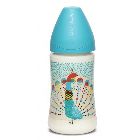 Suavinex бутылка 270 мл круглая силиконовая соска 3 потока Peacock, голубой павлин