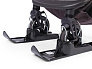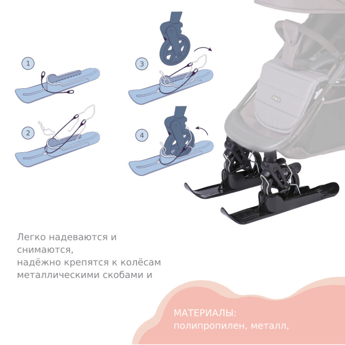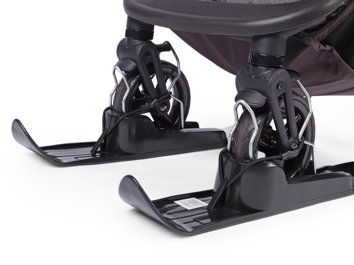 Лыжи для детской коляски надёжно крепятся к колёсам металлическими скобами и стяжкой.
