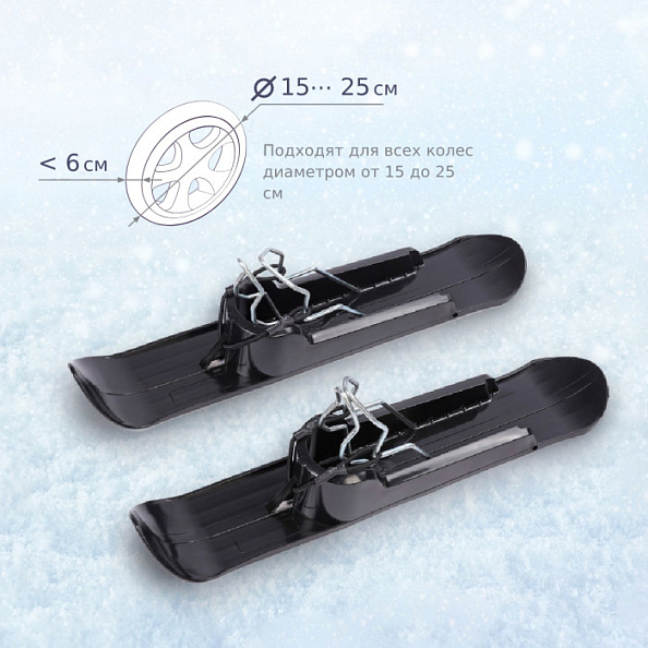 Лыжи на коляску облегчат зимние прогулки, как по утрамбованному снегу, так и по просто плохо расчищенной дороге. Полозья на коляску подходят для всех колес диаметром от 15 до 25 cм и шириной до 6 см.