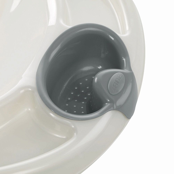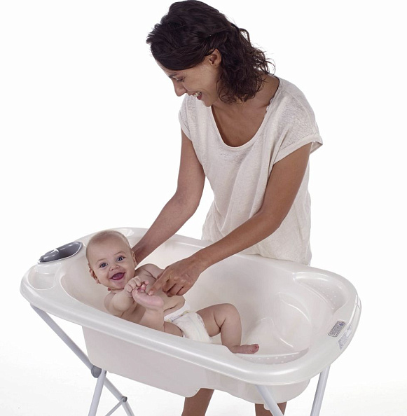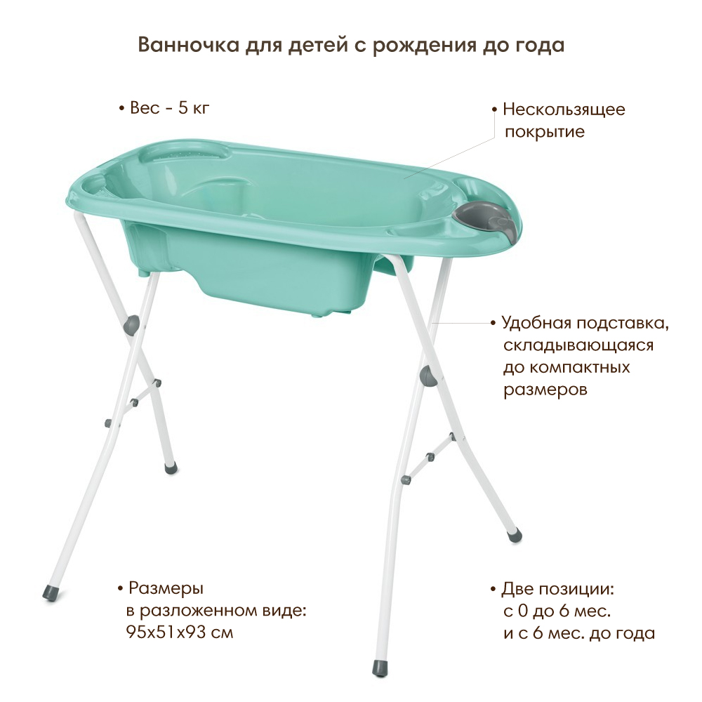 Нескользящее покрытие обеспечивает комфорт и безопасность малыша в ванне. Включает подставку, предназначенную исключительно для этой ванны. Подставка легко и быстро складывается, не занимая много места. Ванночка оснащена сливом воды с помощью шланга, входит в комплект.