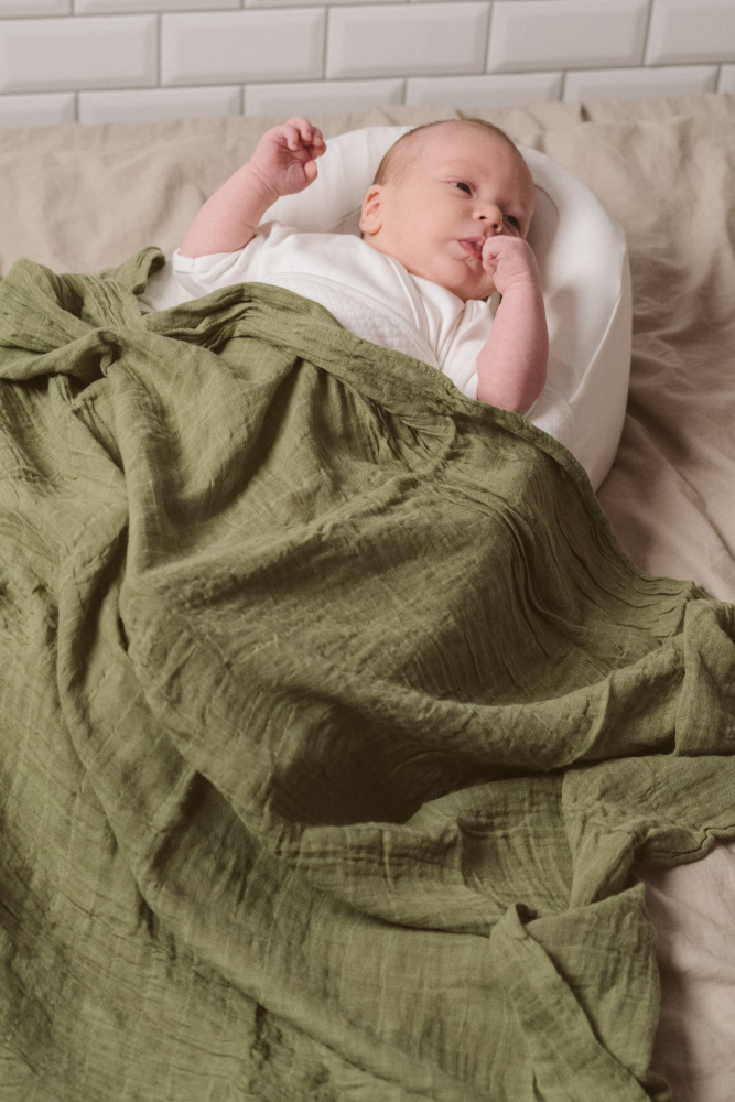 Сон в муслиновых пеленках комфортный и безопасный, так как именно излишний перегрев и, как следствие, влажная среда на коже малыша, приводят к аллергическим проблемам с кожей.