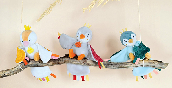 Она изготовлена из очень мягкого материала, нежные оттенки прекрасно дополняют друг друга. Крылья, хвост и макушка головы украшены маленькими цветными элементами, которые ребенок может хватать и даже пробовать на вкус.