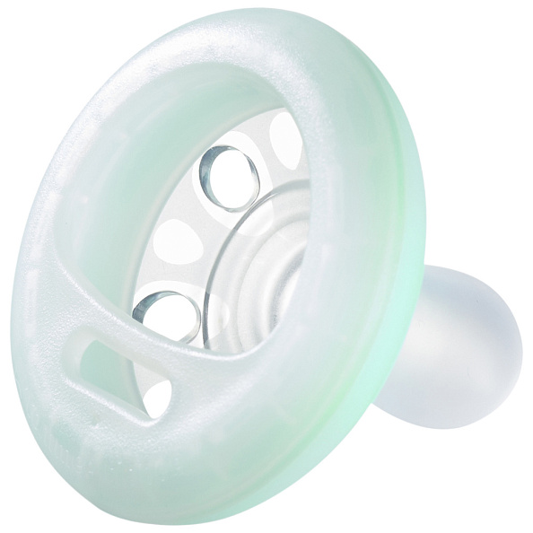 Пустышка удобно располагается между подбородком и носом ребенка, а отверстия с каждой стороны обеспечивают дополнительный приток воздуха и предотвращают раздражение нежной кожи малыша.