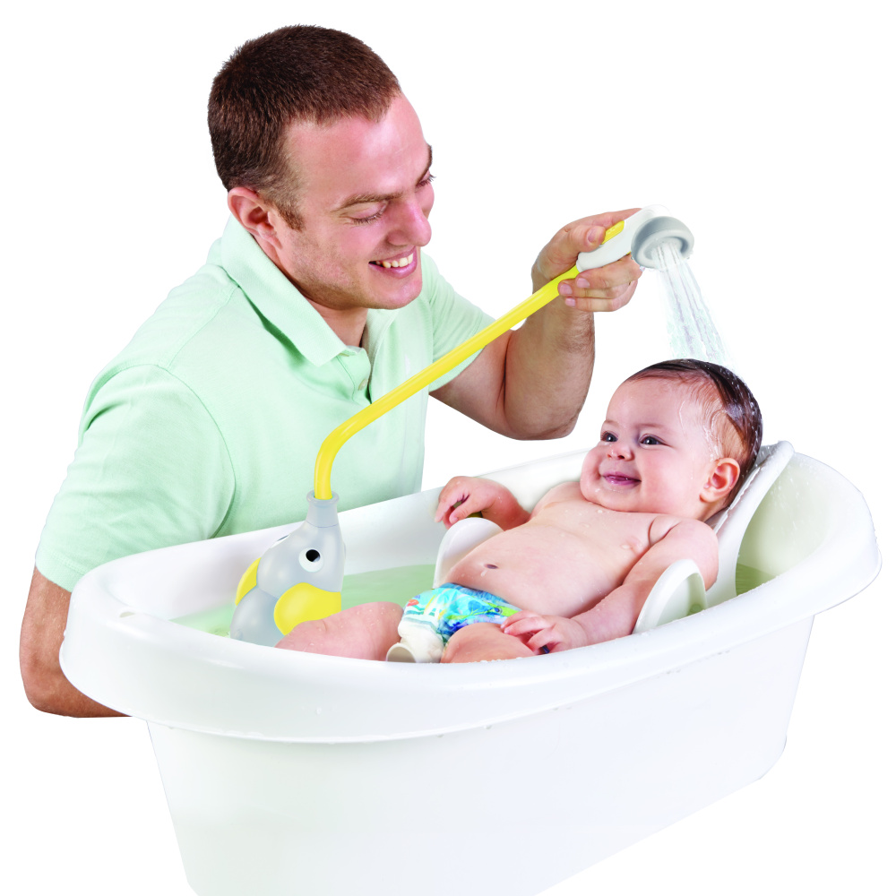 Душ выполнен в виде слоника, на конце хобота которого расположена небольшая насадка. Струя водички без сильного напора льется из душа, она мягко смывает средства для купания, нежно массируя кожу ребенка.