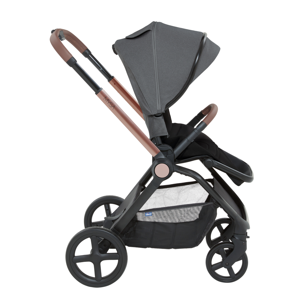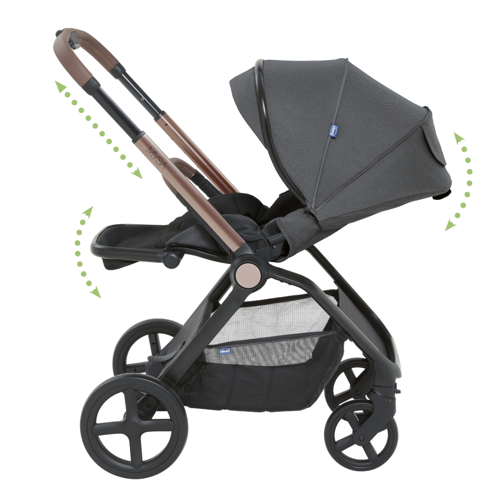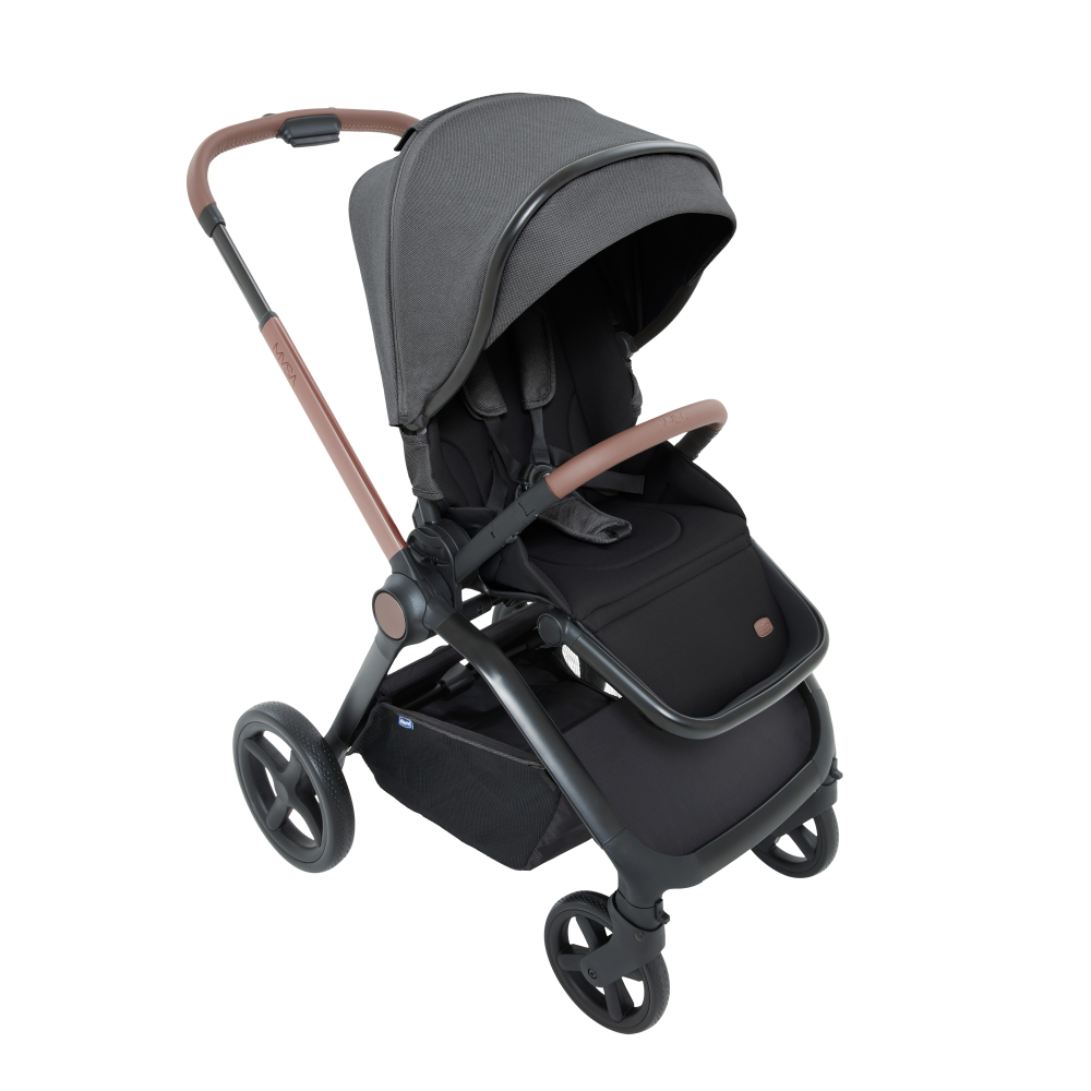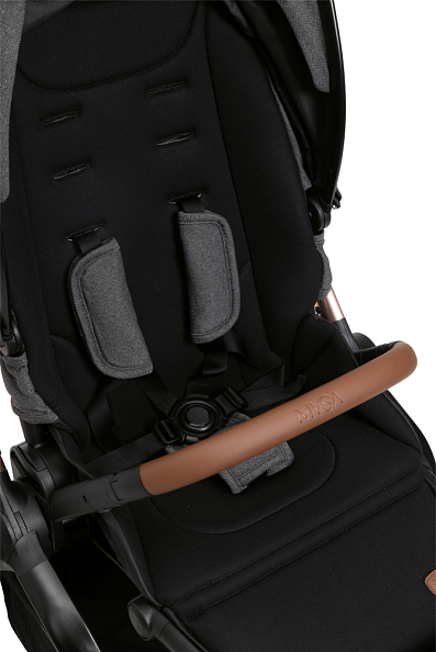 Легко переустанавливается из положения по ходу движения в положение против хода. Широкое и удобное сиденье с высокой спинкой и пятиточечными ремнями безопасности с мягкими накладками, регулируются по высоте в трех положениях. Ручка регулируется в нескольких положениях и имеет премиальное покрытие. Открывающийся бампер с премиальным покрытием.