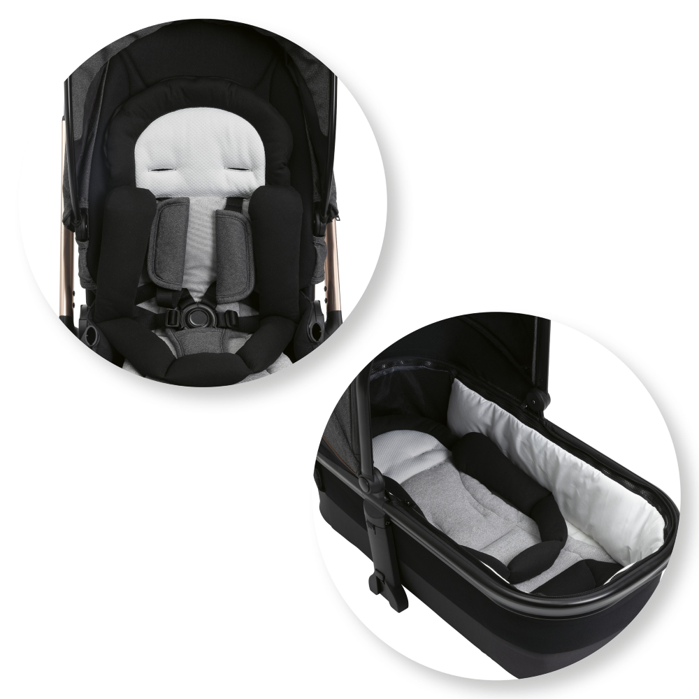 Многофункциональный вкладыш может использоваться с рождения как в прогулочной коляске, так и в люльке, и имеет различные конфигурации в зависимости от возраста.