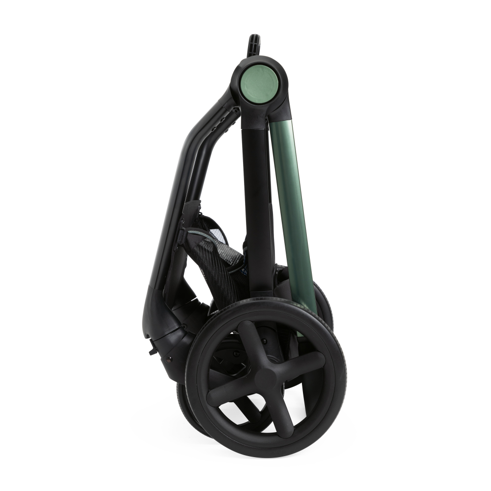 Коляска легко складывается одной рукой вместе с сидением в положениях по ходу и против хода движения. Стоит без опоры в сложенном виде, компактная и легковесная.