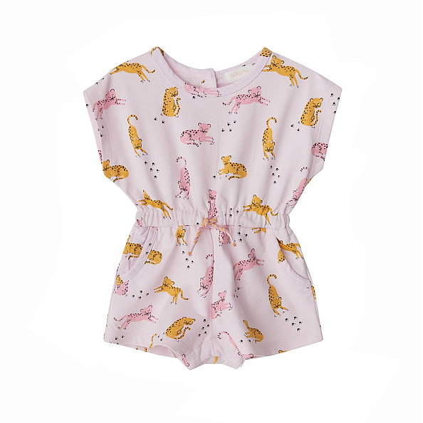 Принт в виде резвящихся ягуаров смотрится игриво, добавляя в общий образ живости и веселья. Комбинезон изготовлен из комфортного ребенку легкого и дышащего 100% органического хлопка.