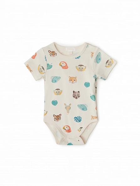Симпатичный комплект состоит из боди, штанишек и нагрудника. Боди с коротким рукавом приятного молочного оттенка и очаровательным дизайном в виде мордочек разных зверей и экзотических птиц. Фиксируется кнопками внизу для удобства смены подгузников.