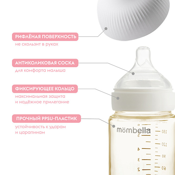 Пластиковая бутылочка для кормления Mombella - must have для молодой мамы. Она состоит из колпачка, соски, стопорного кольца и самой ёмкости для смеси. В дизайне Mombella все линии плавные и мягкие, нежные, но уверенные – и именно так, легко, плавно и спокойно, происходит переход от груди к бутылочке. И обратно.