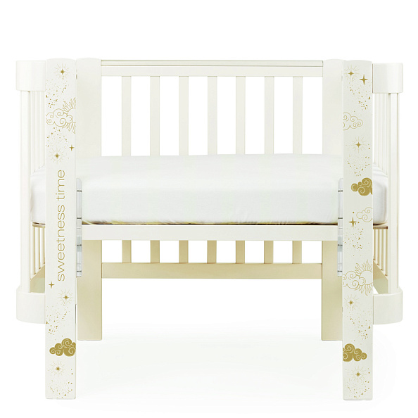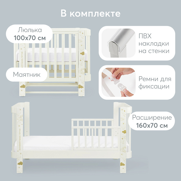 Комплектация: люлька-кроватка, расширение для кроватки, маятниковый механизм, крепежный ремень 2 шт., ПВХ накладки, 4 колеса с 4 тормозными механизмами. Матрас и постельное белье в комплект не входят!