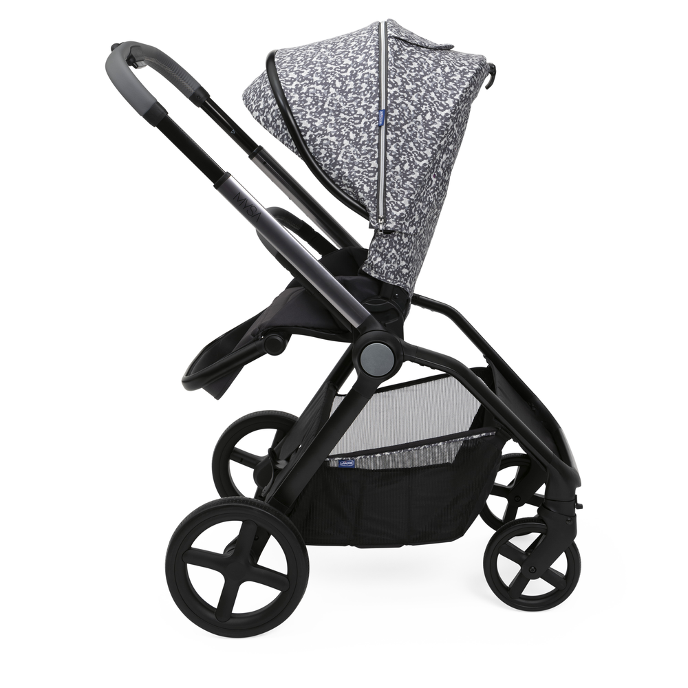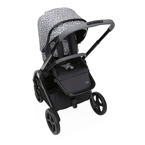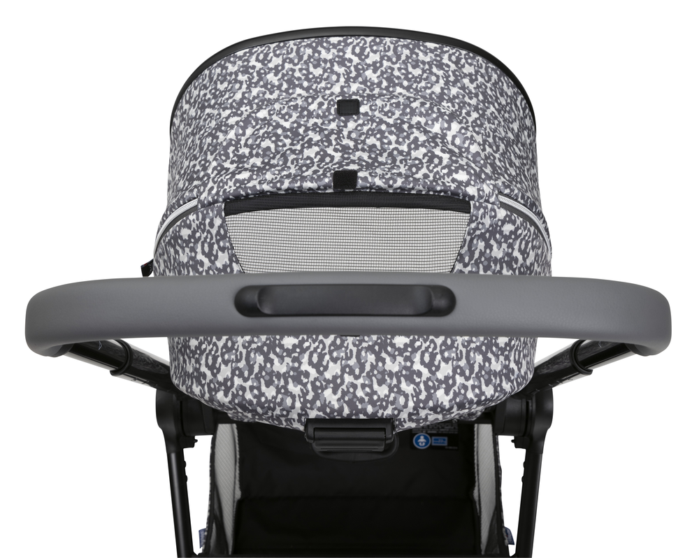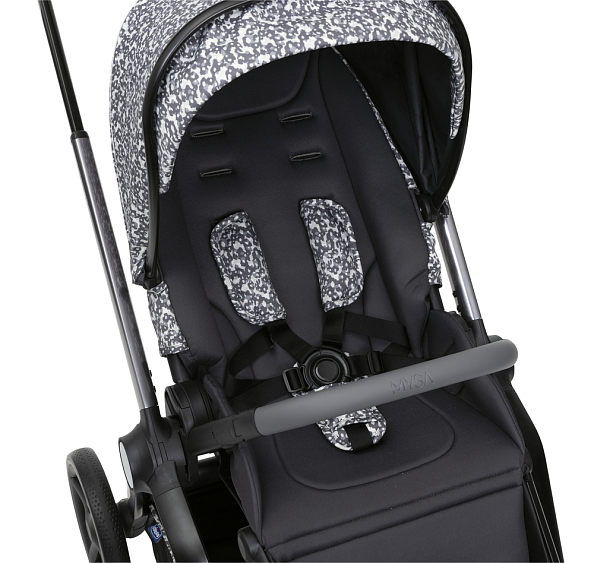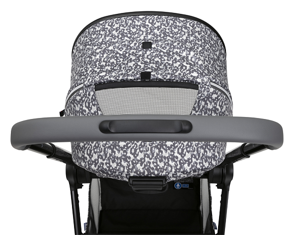Легко переустанавливается из положения по ходу движения в положение против хода. Широкое и удобное сиденье с высокой спинкой и пятиточечными ремнями безопасности с мягкими накладками, регулируются по высоте в трех положениях. Ручка регулируется в нескольких положениях и имеет премиальное покрытие. Открывающийся бампер с премиальным покрытием.