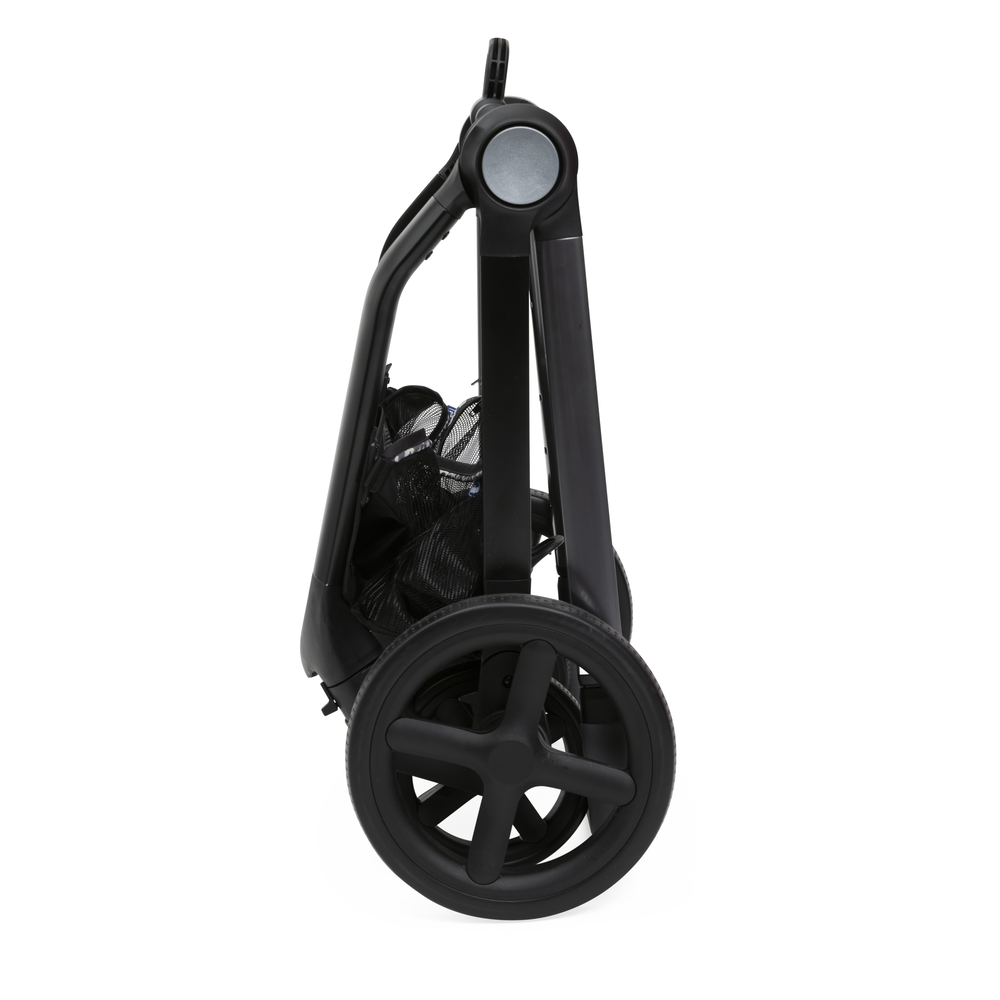 Коляска легко складывается одной рукой вместе с сидением в положениях по ходу и против хода движения. Стоит без опоры в сложенном виде, компактная и легковесная.