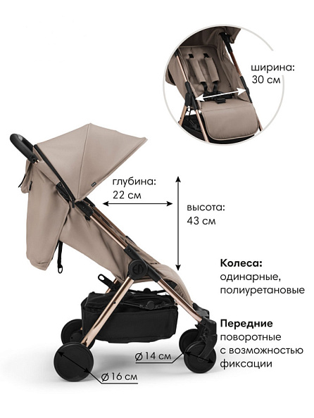- Диаметр колес: передние - 14 см, задние - 16 см