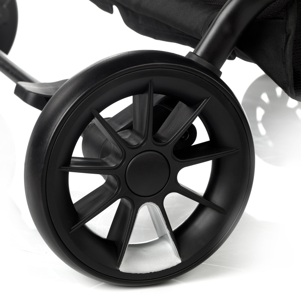 Подвеска на всех четырех колесах обеспечивает плавный ход даже на неровных поверхностях. 5-точечные ремни безопасности на обоих сиденьях гарантируют надежную фиксацию малышей. Регулируемые подножки для каждого ребенка позволяют подстроить коляску под индивидуальные потребности.