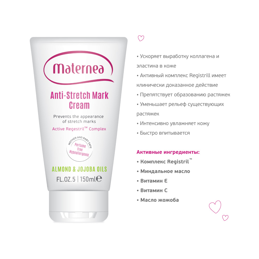 Формула крема от растяжек Maternea содержит специально подобранные натуральные активные вещества, растительные масла и витамины с высокой проникающей способностью, которые обеспечивают и поддерживают упругость кожи, глубоко ее гидратируют и защищают, сохраняя ее гладкость и мягкость.