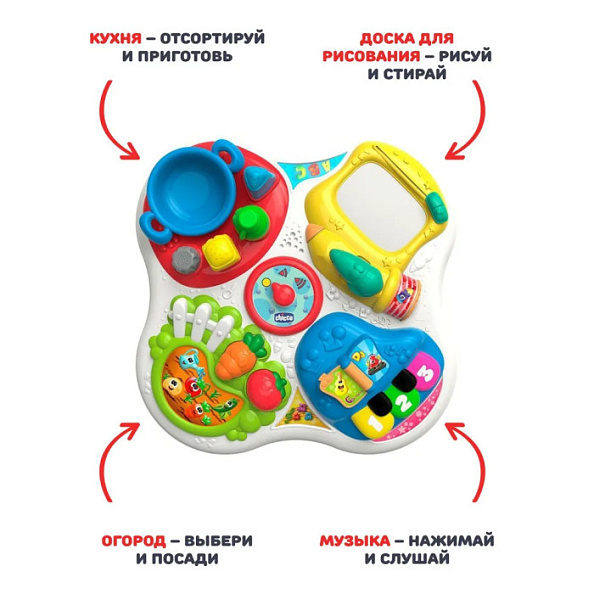 Обучает первым словам и развлекает ребенка при помощи различных звуков и мелодий. Малыш познакомится с миром искусства, садоводства, кулинарии и музыки. Благодаря съемным предметам, малыш может активно принимать участие в различных ролевых играх и подражать взрослым. А изучение русского и английского языков станет еще веселее, интереснее и проще.