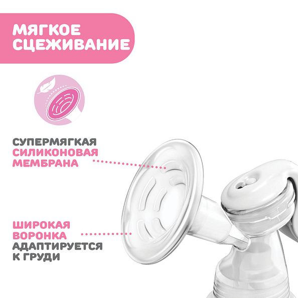 Ручной молокоотсос от итальянского бренда Chicco - идеально подходит для эффективного и аккуратного сцеживания молока, помогает продлить грудное вскармливание как можно дольше. Молокоотсос изготовлен из высококачественных материалов и не содержит бисфенола-А, что делает его применение безопасным для ребенка. Супермягкая силиконовая мембрана воронки молокоотсоса выполнена из экстрамягкого силикона "mum effect", напоминающего мамину грудь, и приятна на ощупь, осторожно охватывает грудь, прекрасно подходит под грудь любого размера. Мягкие лепестки силиконовой мембраны стимулируют приток молока во время сцеживания и напоминают процесс сосания груди ребенком.